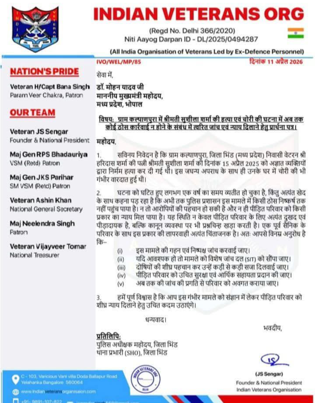 राजनीति पूर्व सैनिकों के न्याय हेतु 15 अप्रैल को बड़ा प्रदर्शन राष्ट्रीय अध्यक्ष जोगिंदर सिंह सेंगर होंगे शामिल, Hasrat Apr 12, 2026 0 मुख्यमंत्री को लिखा पत्र भिंड। जिले के अटेर विधानसभा अंतर्गत ग्राम कल्याणपुरा में भूतपूर्व सैनिक हरिदास देपुरिया की पत्नी की… Read More